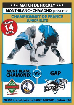 Championnat Elite U22 Mt-Blanc/Chamonix vs Gap Samedi 14 avril à 20h30 patinoire de St-Gervais. Entrée 3 € Dimanche 15 avril à 18h30 patinoire de Chamonix. Entrée gratuite
